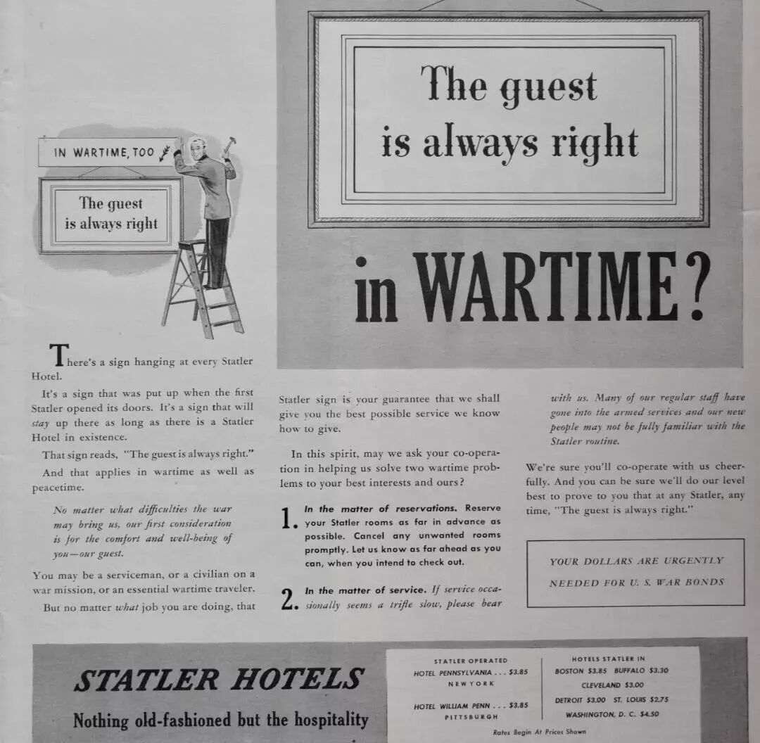 后来的故事我们也都知道了。斯塔特勒最终成为了一代酒店巨擘,打造出了斯塔特勒连锁酒店集团,被誉为“现代酒店之父”,而他的每一家酒店的大门口,都挂着一块牌子,上面写着:“客人永远是对的”。这句话也频频出现在斯塔特勒酒店的广告中,放在非常醒目的位置。