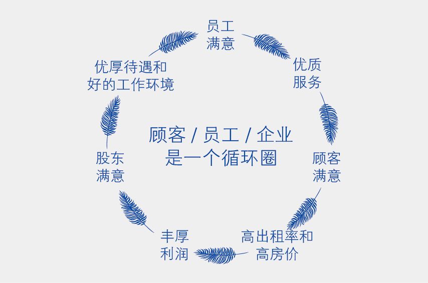 我也非常欣赏四季酒店创始人伊莎多瓦·夏普先生说的一段话(大意):财务上的成功不应该作为一个目标,而应该把它视为一个自然的结果—— 当你照顾好了员工、顾客和合作伙伴后,酒店自然就会有利润。