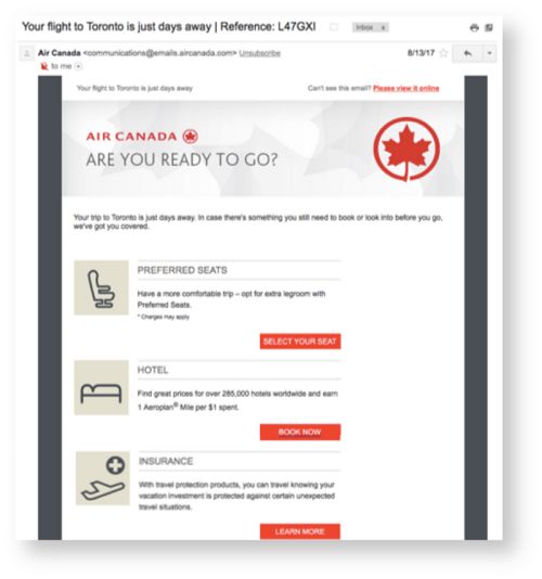 航空公司(包括廉价航空)的标准做法是在预订完成后、航班出发数个星期和几天前分别向客户定时发送旅行前的电子邮件、短信和推送通知。