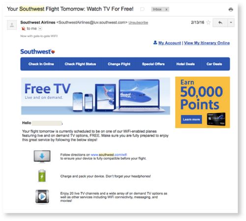 客人办理入住的前一天,酒店应该继续为客人创造值得期待的入住体验,向他们介绍一些酒店活动或免费服务,比如在线办理入住,机场接送等。西南航空会在航班出发前一天向乘客发送最后一条包含了机上免费服务的提示信息,借此打造友好、高价值的航空公司品牌。
